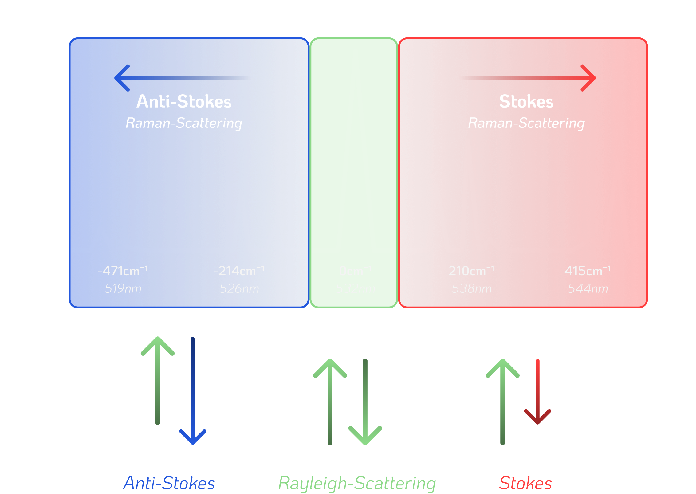Since the ‘normal’ scattering is so intense, and the Raman effect so weak, the signal needs to be filtered again to reduce noise on the sensor. So, again, anything below 550nm is not allowed to pass and we end up with practically just the desired Raman-shifted wavelengths.